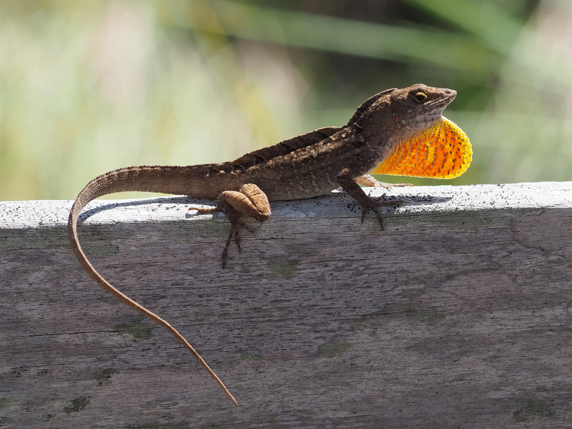 - large dewlap (fan gulaire) chez le mâle, généralement orange à rouge bordé de jaune