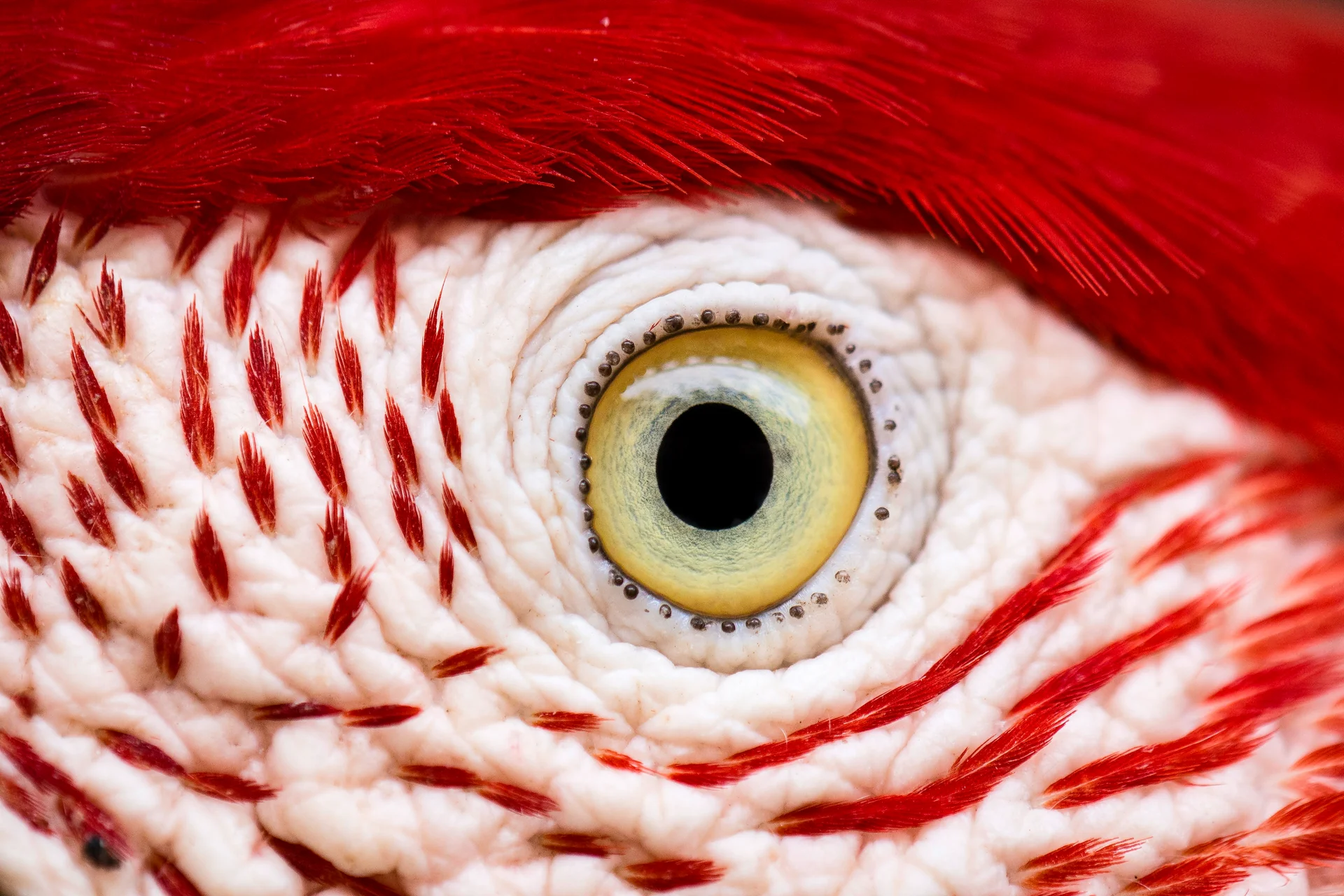 - tache faciale blanche nue parcourue de fines lignes rouges de petites plumes