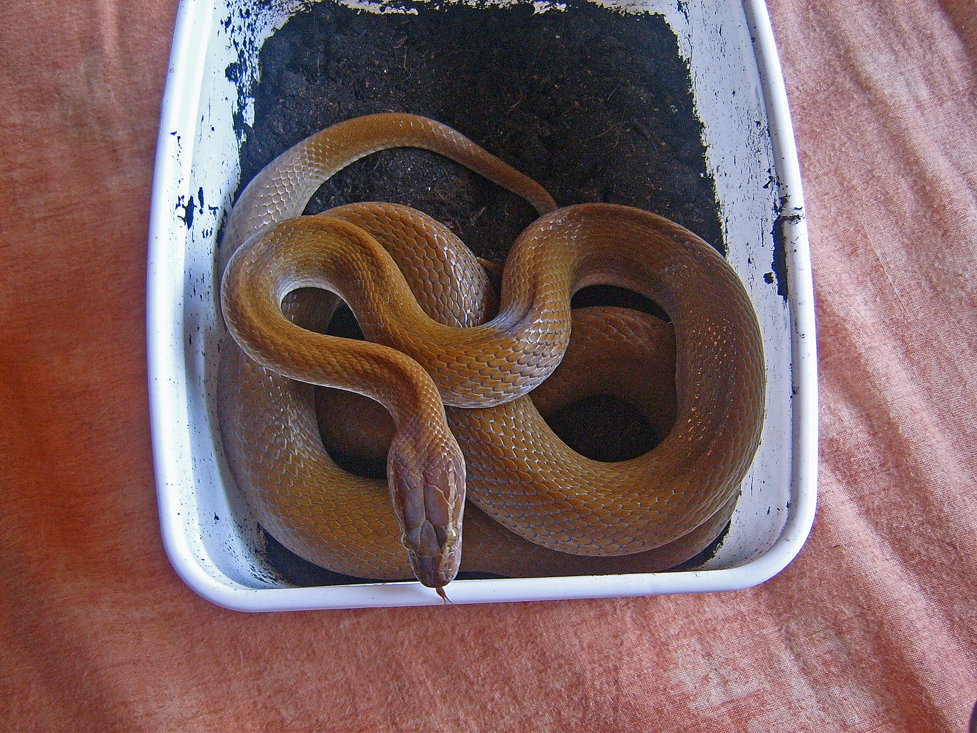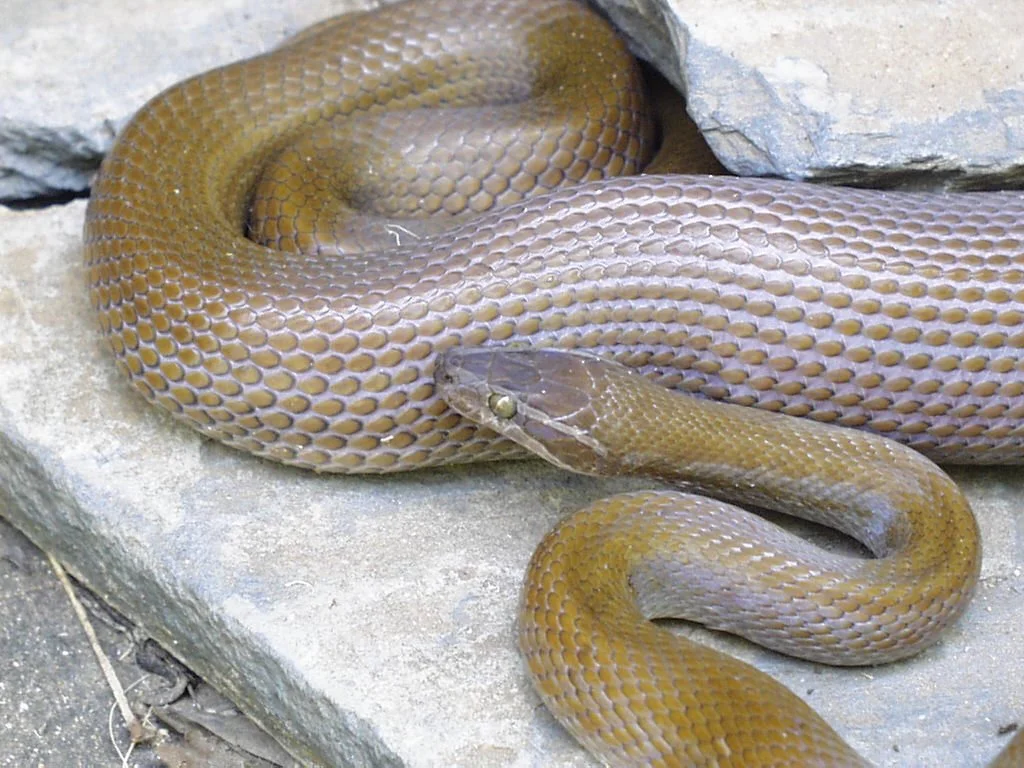 - Couleur variable : brun foncé, noir, olive, parfois avec des marques claires en forme de chaîne sur les flancs