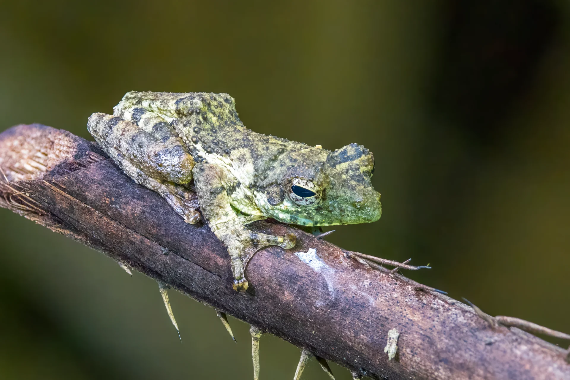 Espèce associée à la végétation arborée au-dessus d'eaux temporaires utilisées pour la reproduction (nids mousse suspendus). Tolérance à un certain degré de modification d'habitat mentionnée par l'évaluation IUCN; altitudes non précisées dans les sources consultées.