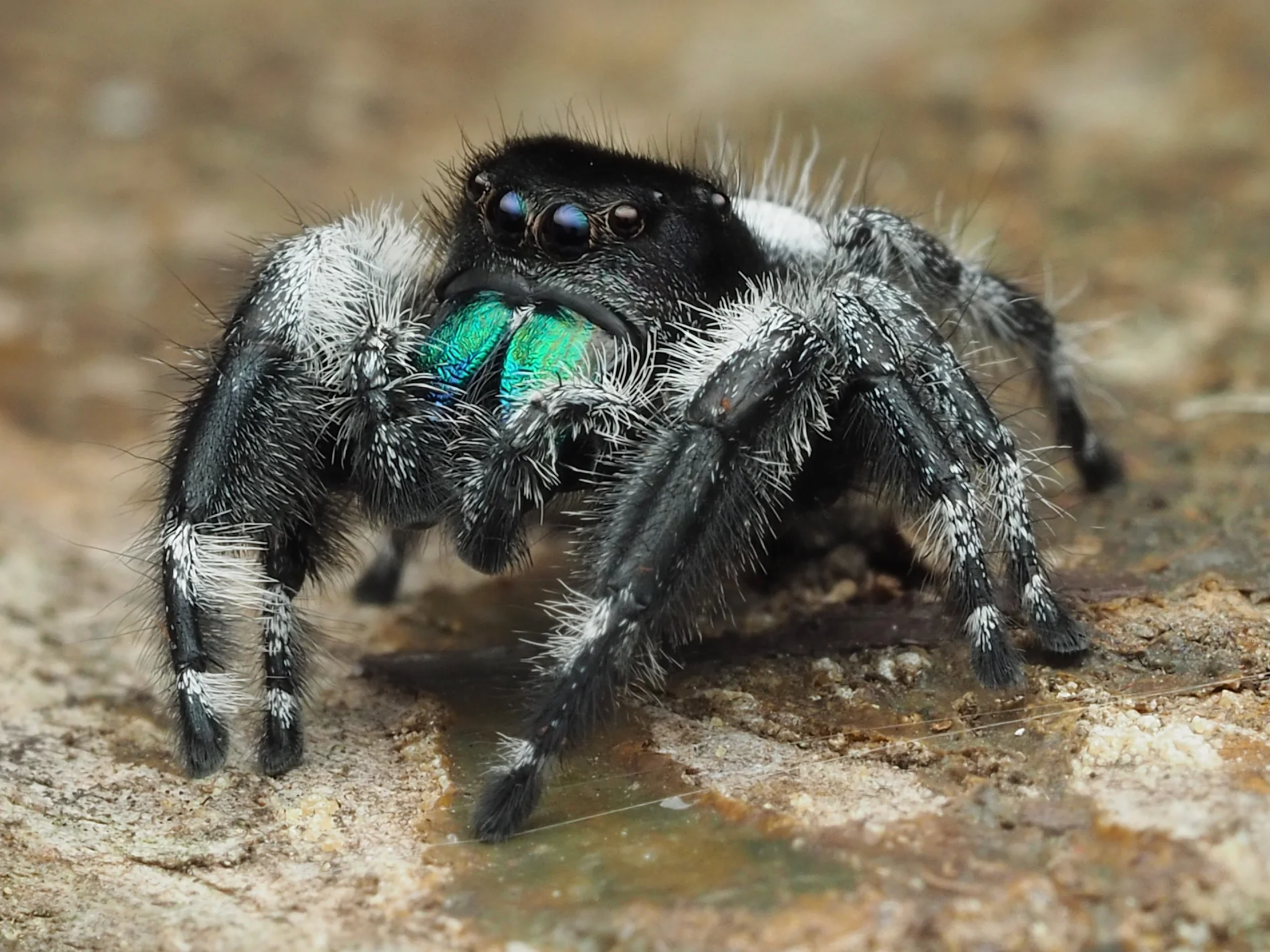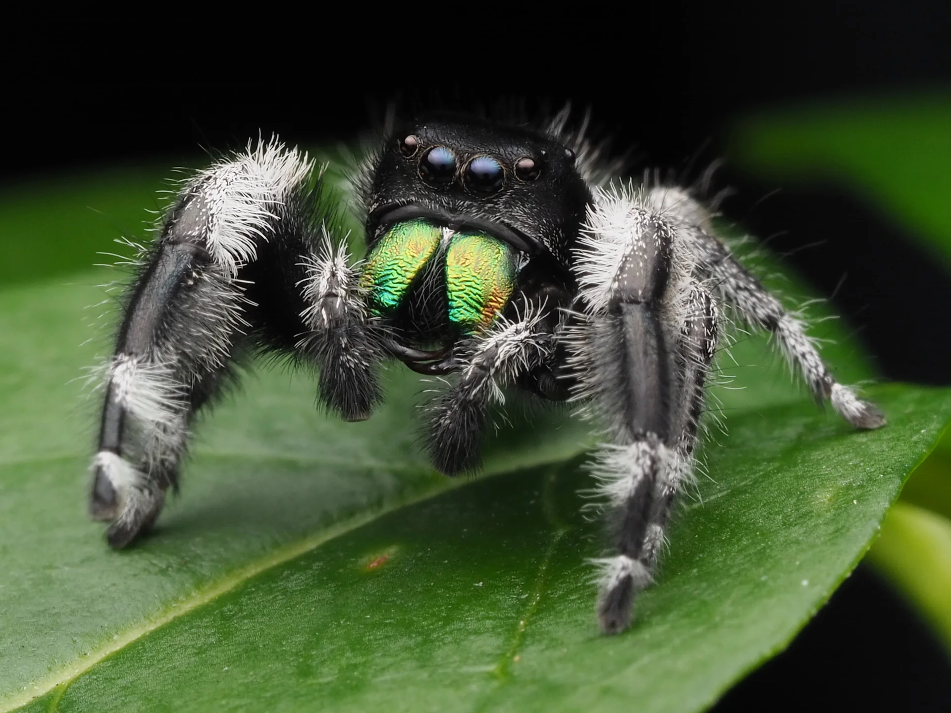 - Mâles : noirs avec taches/blanc, chélicères vert-bleu irisées, pattes antérieures plus longues